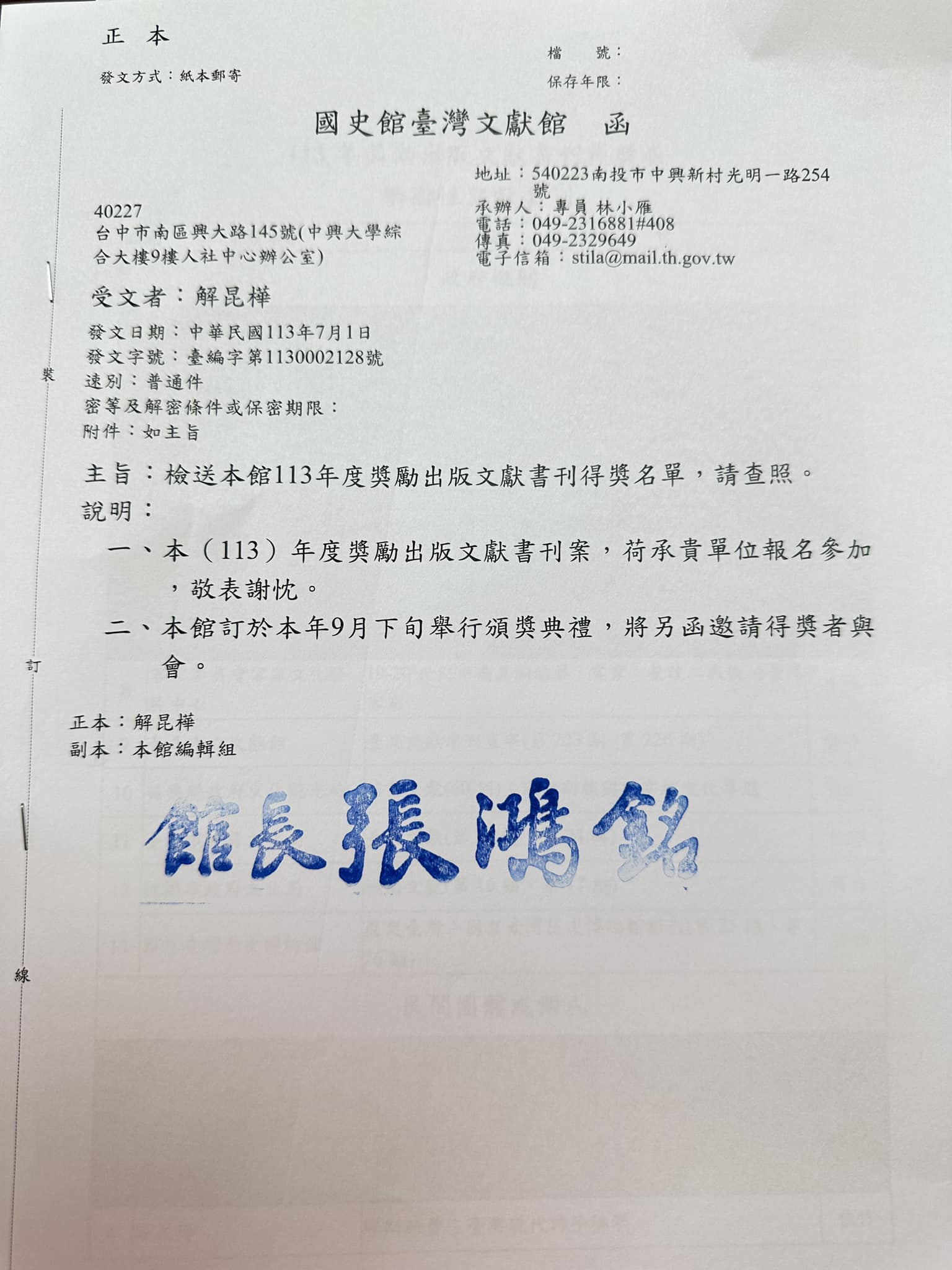 113年國史館臺灣文獻館獎勵出版文獻書刊評審獎