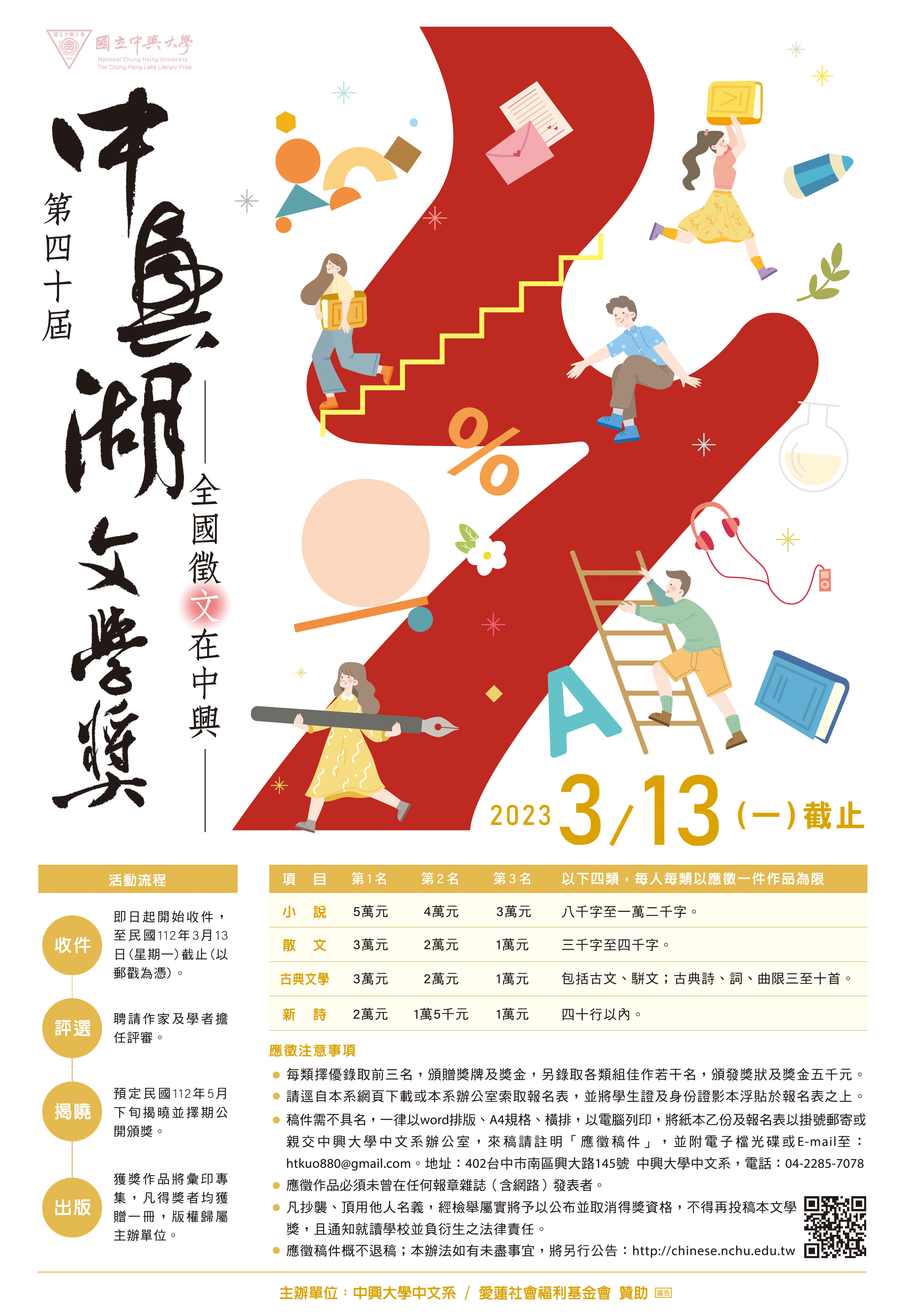| 徵文辦法 | 第40屆中興湖文學獎全國徵文比賽 | 徵文海報徵文辦法報名表 |