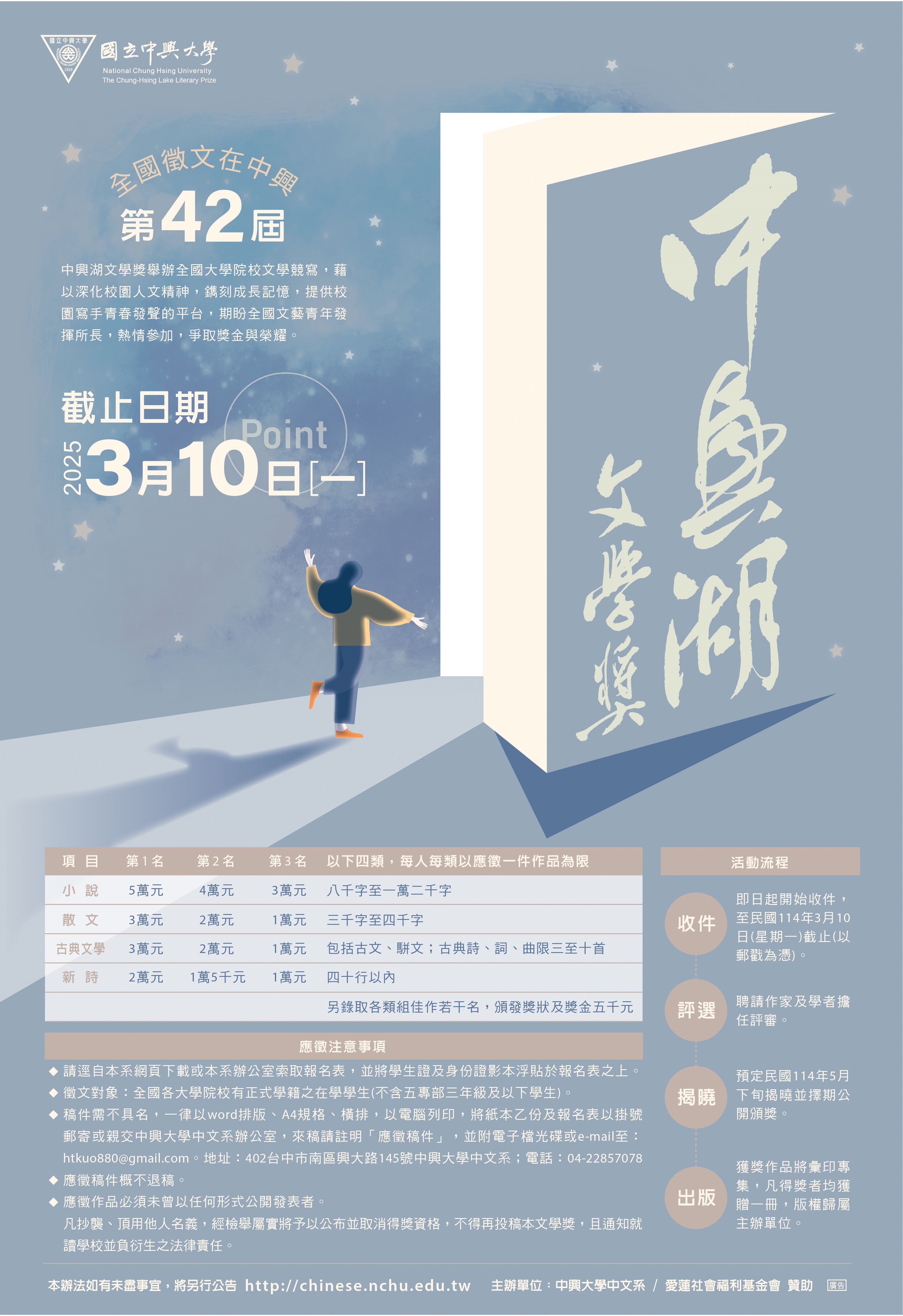 | 徵文辦法 | 第42屆中興湖文學獎全國徵文比賽 | 徵文海報徵文辦法報名表 |