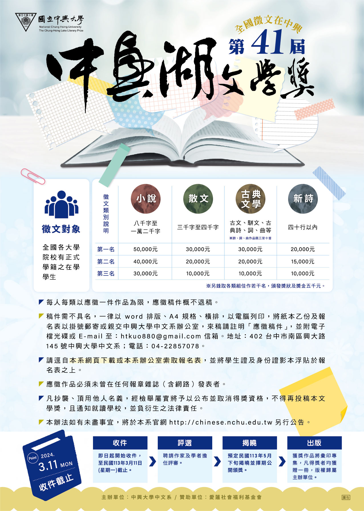 | 徵文辦法 | 第41屆中興湖文學獎全國徵文比賽 | 徵文海報徵文辦法報名表 |